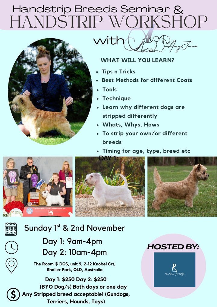 Saturday: Seminar in the AM learning about handstripping and structure of breeds. (Terriers, Gundogs, Toys, Hounds) Profiles and whys and hows. A hands on workshop in the afternoon. 9am-4pm