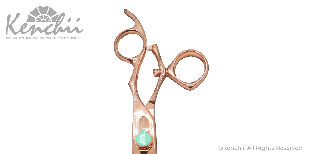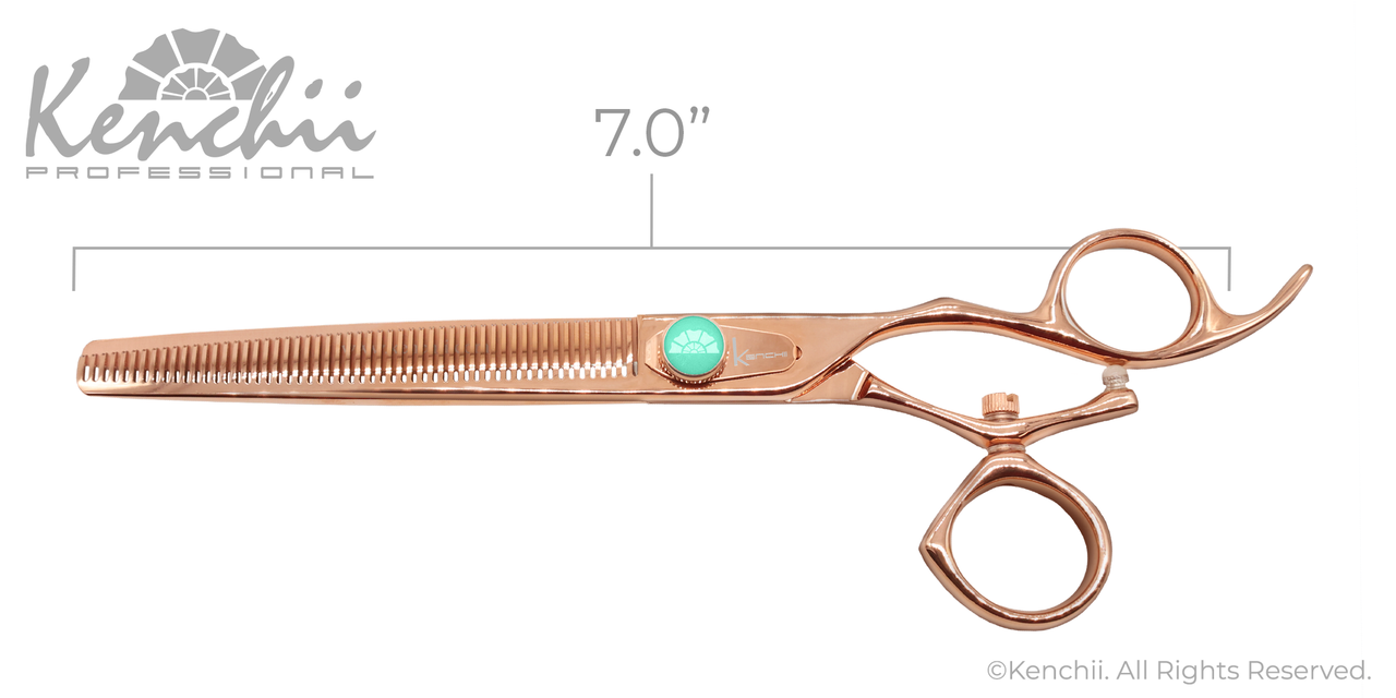 Kenchii Rosé Swivel scissors and thinners are made from Kenchii proprietary level 2 Japanese molybdenum materials enrobed with rose gold titanium. Semi-convex, microserrated edge is designed to reduce slippage and enhance cutting performance. Great for everyday grooming.