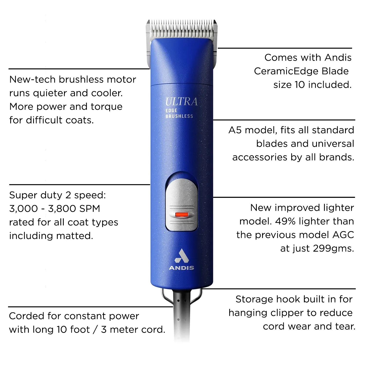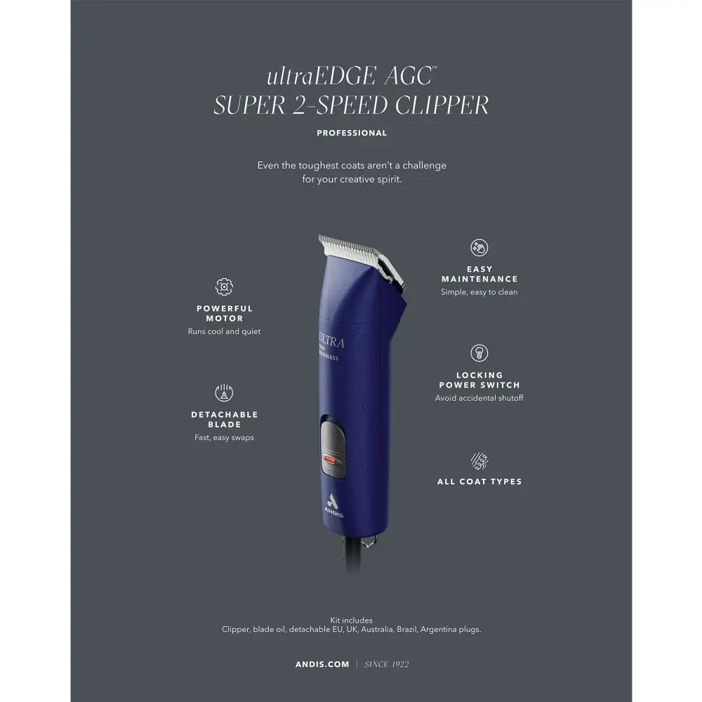 The Andis UltraEdge AGC Brushless Super 2-Speed Clipper in Cobalt Blue is a high-performance, professional-grade grooming clipper designed for serious clipping on all coat types. Now lighter, quieter, and more powerful than ever, this upgraded brushless model delivers two high-speed settings (3,000 and 3,800 SPM) and is rated for super-duty use—from everyday trims to tackling thick, matted, or non-shedding coats with ease. Comes ready to use with a premium CeramicEdge #10 blade and full A5 blade and universal comb compatibility.