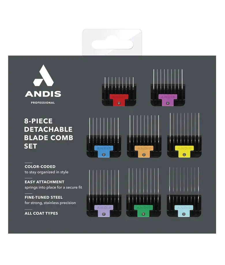 Colour coded 8 piece stainless-steel comb set Fits #30 or #10 blade