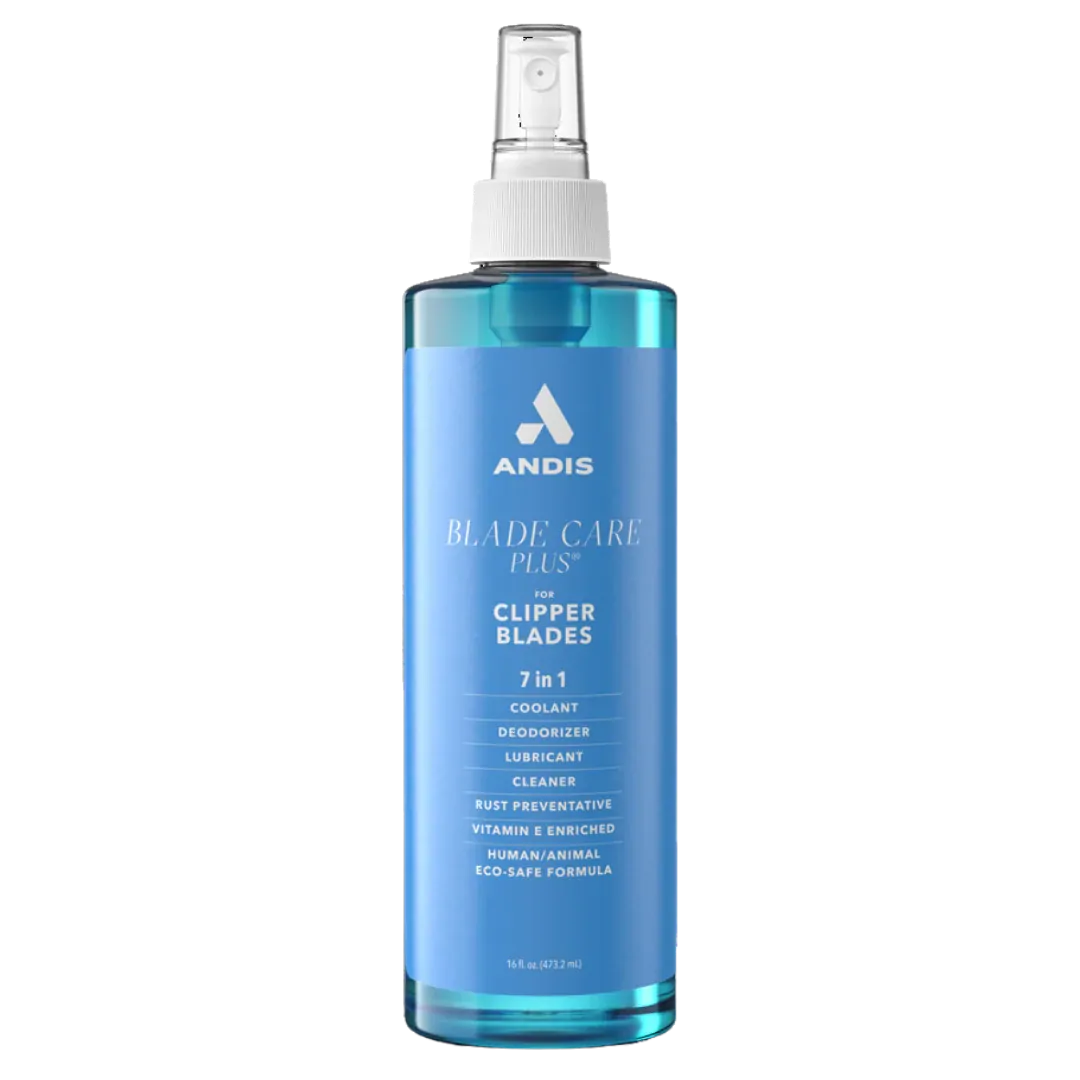 Andis Blade Care Plus in the 473ml size spray bottle. 7 in 1 formula. Cools, cleans, deodorises, lubricates and prevents rust. Apply oil after use (does not replace the need for oil). Enriched with Vitamin E to reduce blade burn and help protect sensitive skin. Spray on to rinse away hair and product build-up in seconds. A grooming essential for care of professional equipment. Human and animal eco-safe.