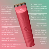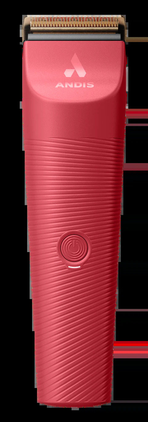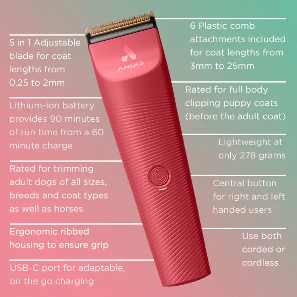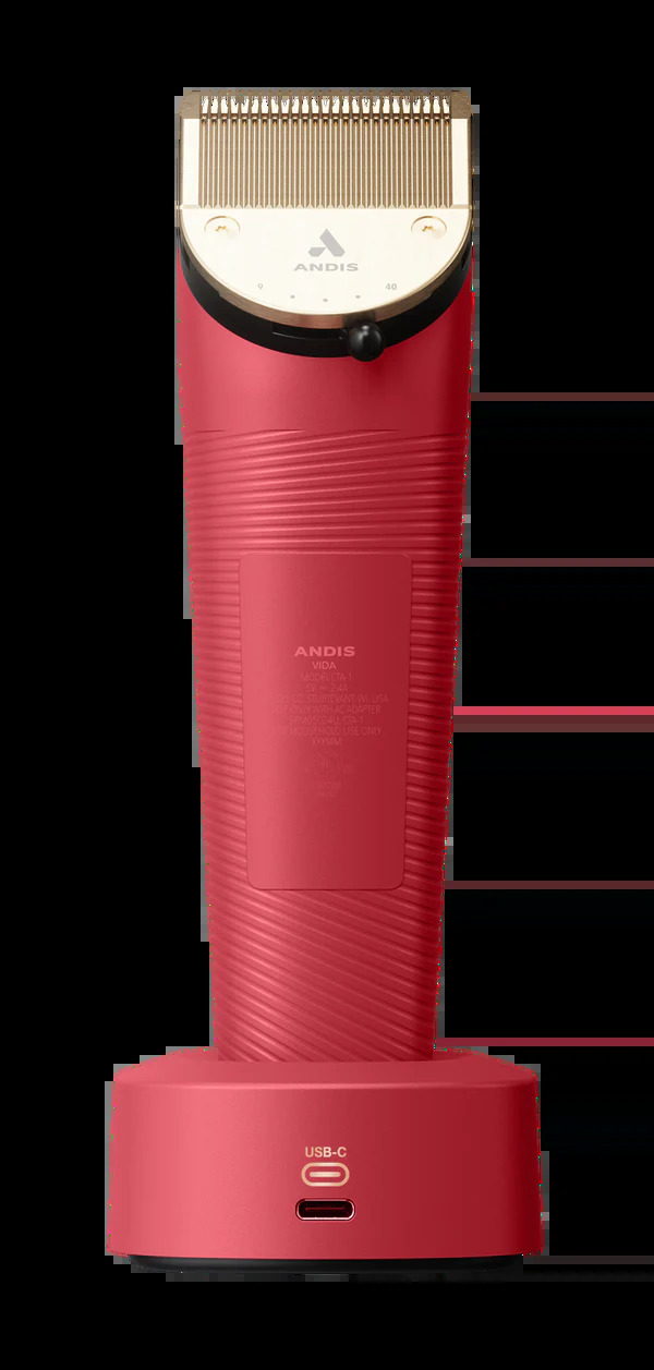 Discover the NEW Andis Vida Cordless 5-in-1 Trimmer and Clipper in a vibrant shade of Raspberry red, engineered for versatile dog grooming. This innovative midi-sized tool offers the perfect balance between a mini trimmer and a full-size clipper, featuring a slim, lightweight design and ergonomic ribbed housing for reduced hand fatigue and superior grip. With its unique adjustable 5-in-1 blade, you can effortlessly achieve five different coat lengths from 0.25mm to 2mm, making it ideal for delicate touch-ups and specific grooming tasks. Rechargeable lithium-ion battery delivers 90 minutes of cordless run time from a 60 minute charge. Runs both corded or cordless.
