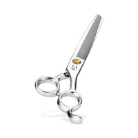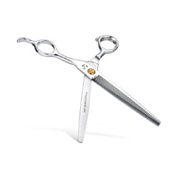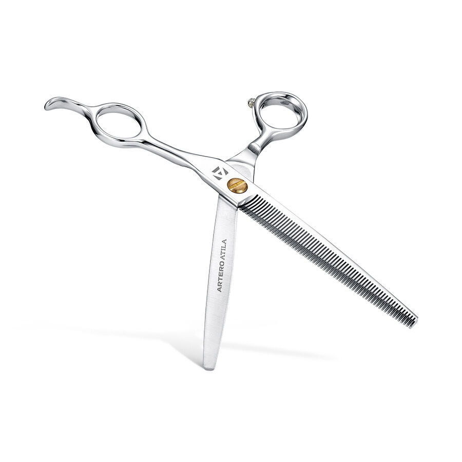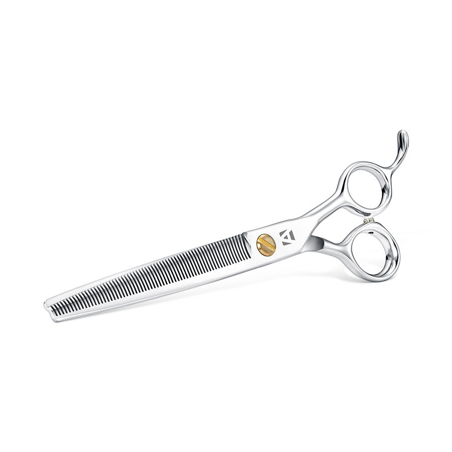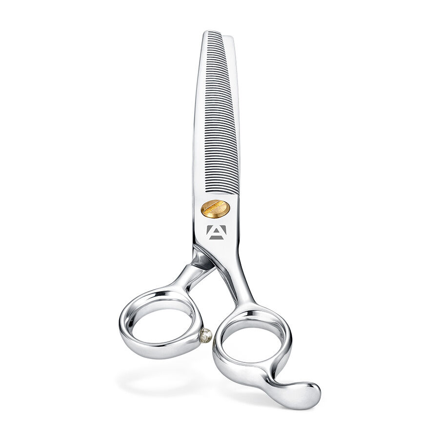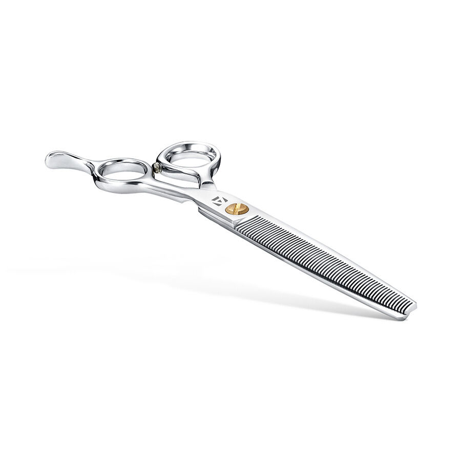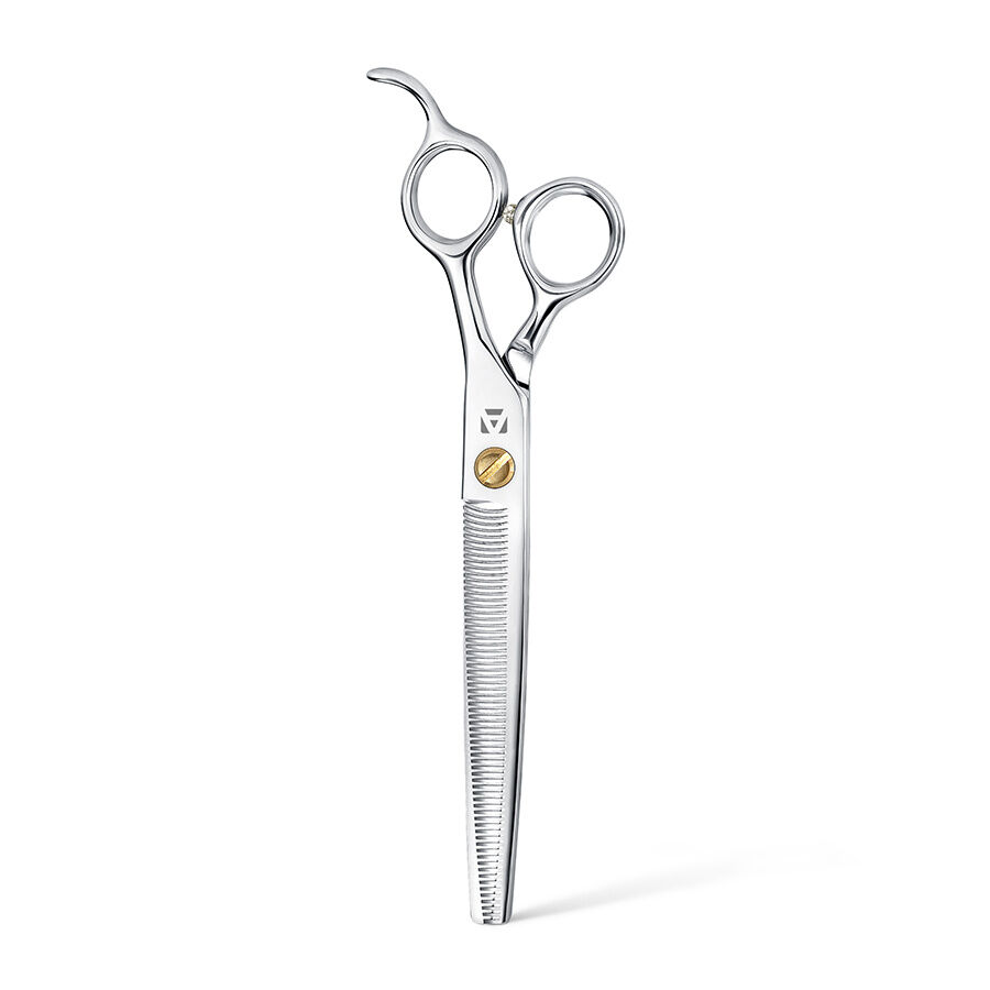 Thinning sculpting scissors with 65 teeth of 7.5 inches (19.5cm) made of Japanese steel 440C. A scissors with wide and thick blades with a large fastening tension screw to be able to work in dense hair. Its short and semi-offset handle, with integrated finger rest, achieves more opening amplitude of the blades to speed up the cut. An ideal scissors for blendings and gradients in medium and large dogs or with a lot of density.
