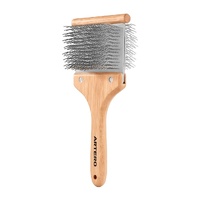 Carding brush with a flexible head, thanks to a metal plate that connects the two sides, allowing it to bend either way to suit the surface you're brushing. It has double-sided, extra-thick bristles for untangling and swiftly removing knots. Remove fur trapped between the bristles with your fingers or a comb.
