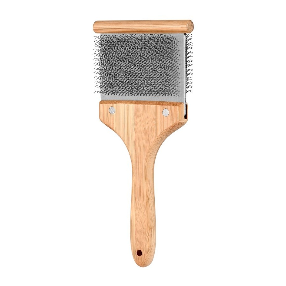 Hold the brush by the handle and place one side on the coat. Slide in the direction of the handle, repeating all over the coat. For straightening, we recommended brushing against the direction of the hair. Remove fur trapped between the bristles with your fingers or a comb.