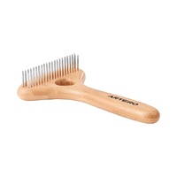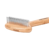 Rake with bamboo body and metal prongs. Double row of fine-tipped prongs that effectively removes a larger amount of shedding hair