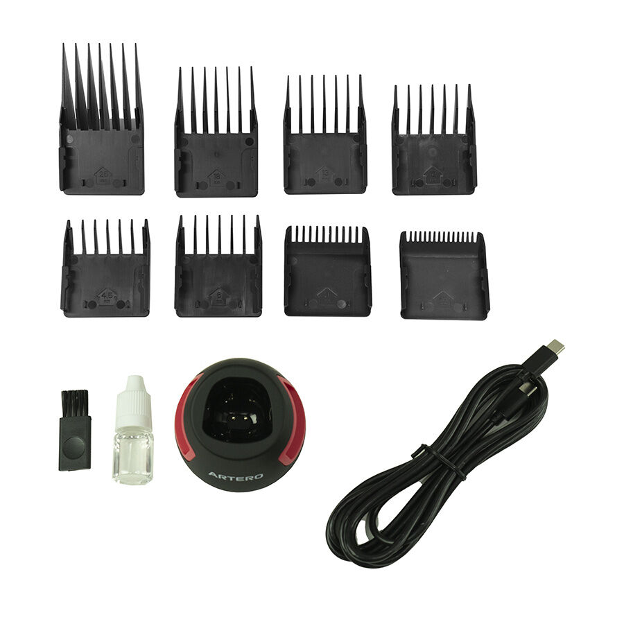 Includes 8 plastic attachment combs (1.5mm - 25mm), oil and cleaning brush.