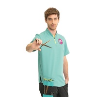 Unisex shirt with a stand-up collar in turquoise. Zip neck, removable scissors hanger and two patches. Short sleeves. Hair-repellent, breathable and comfortable fabric.