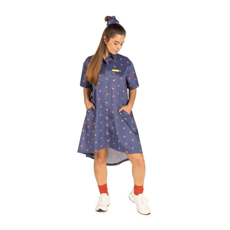 The Tokio blouse stands out for its versatility, since it can be used as a dress or loose garment. Its blue and coral print with canine motifs and shirt collar design give it an elegant and functional touch.