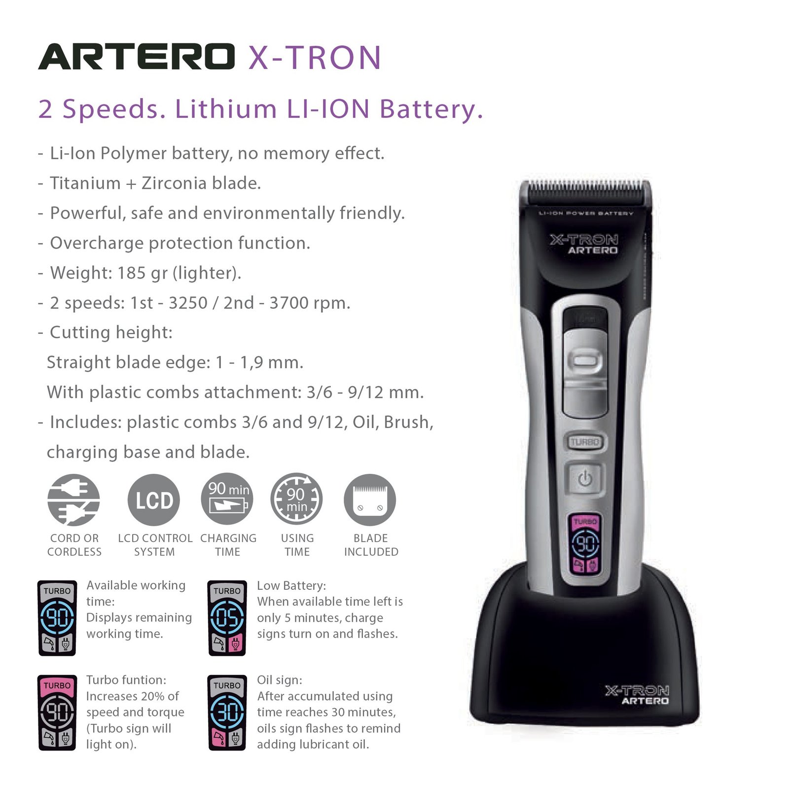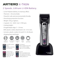 INCLUDES: . Base charger and adapter, blade, 2 attachment combs, Brush & cleaning lubricant