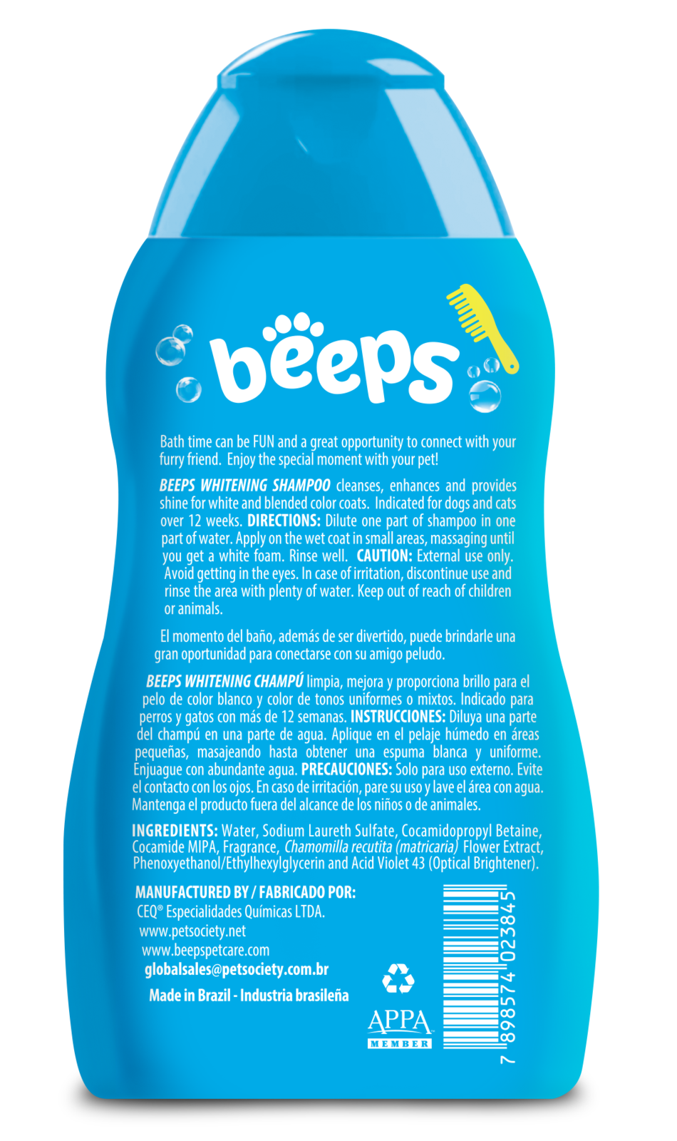 Help your hound achieve a brilliant white coat with Beeps Chamomile Extract Whitening Dog Shampoo! Specially formulated for dog’s with white or light coats, this shampoo is infused with chamomile, which helps encourage a brighter, shinier coat and cleanses the fur to help remove red and yellow staining. Not only will you love how this shampoo makes your dog’s coat look and feel, but you’ll also love the way it will make her smell, thanks to the pleasant blueberry scent!