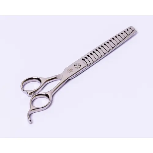 A uniquely designed 7.0 inch, 18 teeth, Blending Dog Grooming Shear with newly designed teeth that will cut through the thickest fur at a faster cutting speed. This wonderful new dog grooming scissor is designed to remove bulk quickly due to the wider blades allowing the scissor to move over a wider surface area with one snip. This pet scissor is unique because it has a widened gap at the base of the comb blade. Additionally, this shape improves cutting speed and holds up even when cutting thick fur. A dog grooming thinning scissor that cuts well without snagging at an affordable price.