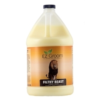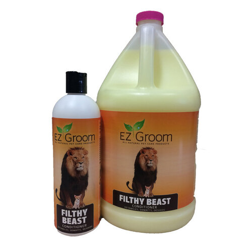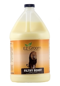 EZ Groom Filthy Beast Detangle and D-Mat Conditioner will amaze you on how well it takes on really dirty, tangled, and matted coats. Rich emollients, nourishing botanicals and silk proteins add fullness and texture to the coat by allowing each hair follicle and shaft to absorb and retain super moisturizers. This FILTHY BEAST® conditioning treatment seals each hair shaft and repairs split ends, helping to reduce hair breakage. Special polymers help to leave the coat tangle and static free, thereby significantly improving combing. This treatment remains locked in each hair shaft maintaining the coat in top condition, keeping it easy to comb in between baths.