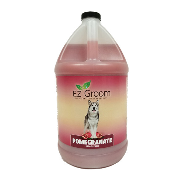 E-Z Groom Pomegranate Shampoo is formulated for professional groomers, being gentle on both the pet's skin and the groomer's hands. A mixture of fine natural & botanical ingredients with a pH balanced hypoallergenic formula adds gleaming luster while removing deeply embedded dirt without drying the coat out. Rinses out easily, leaving behind a fortified, strengthened, and tangle free coat.