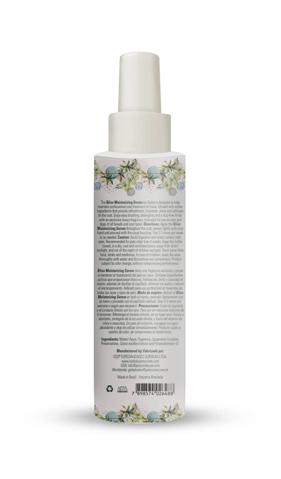 Hydra Pet Spa Senses Bliss Moisturizing Serum is designed to help maintain the look of a professional coat treatment without having to leave home. Infused with active ingredients that refresh and hydrate while adding both shine and softness to the coat.