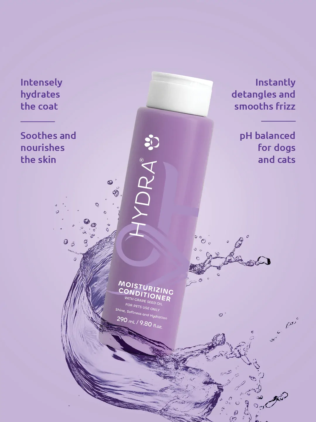 Hydra Moisturizing Conditioner is a rich, pH-balanced pet conditioner infused with soothing Oat Extract and nourishing Grapeseed Oil. This ultra-conditioning formula melts into the coat, reducing frizz, improving shine, and making detangling effortless. Ideal for dogs and cats of all breeds and coat types over 4 weeks of age.