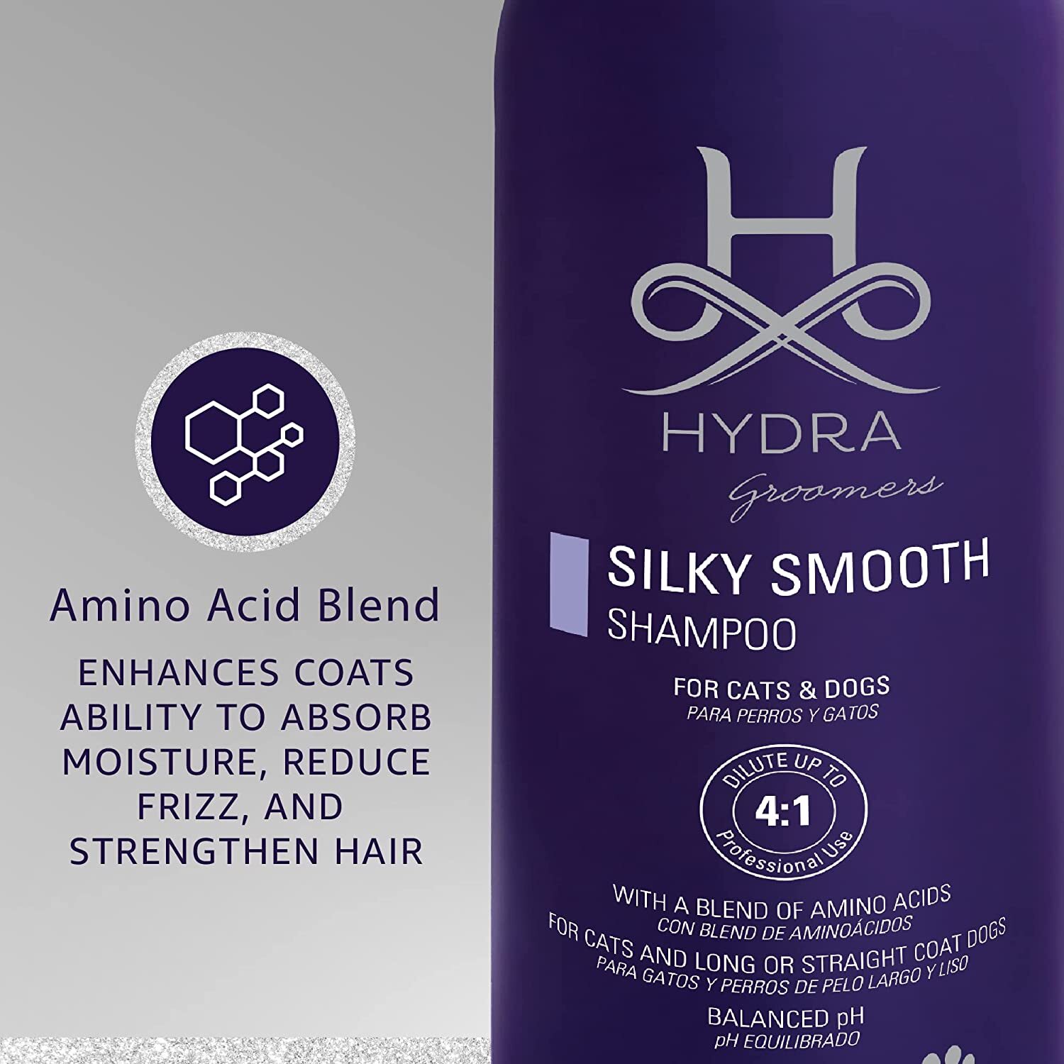 Hydra Silky Smooth Shampoo is formulated for professional use on dogs and cats with long and straight coats. Its concentrated formula 4:1 contains a blend of amino acids that provides hydration and maintains the coat with a straight effect.