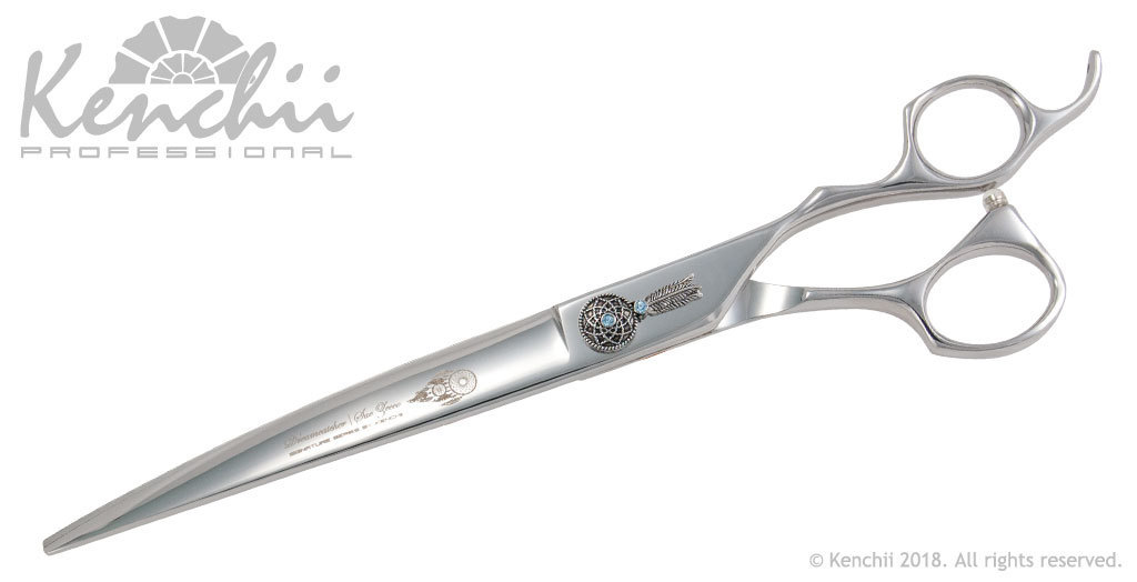 We are excited to announce our newest series the Dreamcatcher™ by Sue Zecco. This beautifully crafted shear was created by Master Groomer Sue Zecco in collaboration with Kenchii Professional. The Dreamcatcher features a unique external assembly dial with a molded dreamcatcher with light blue stone accents. This Dreamcatcher shears are made with Kenchii level 3 metals with an offset handle for comfort and a convex edge recommended for finishing work. Available in: 8" straight, 8" curved, 18-Tooth reverse Blender, and 36-Tooth Thinner (total length 7")