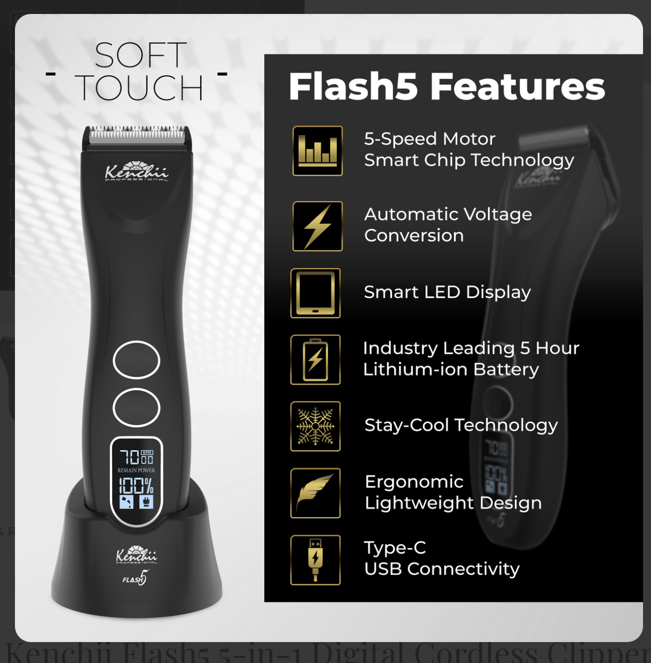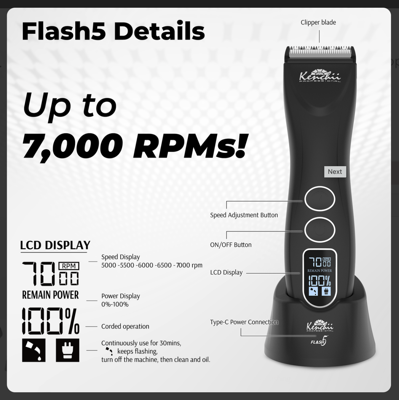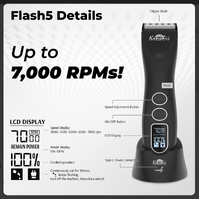 The Kenchii Flash5™ Pet Grooming Clipper combines cutting-edge technology with a sleek, ergonomic design. Engineered for professional and home groomers, this clipper delivers precision, power,