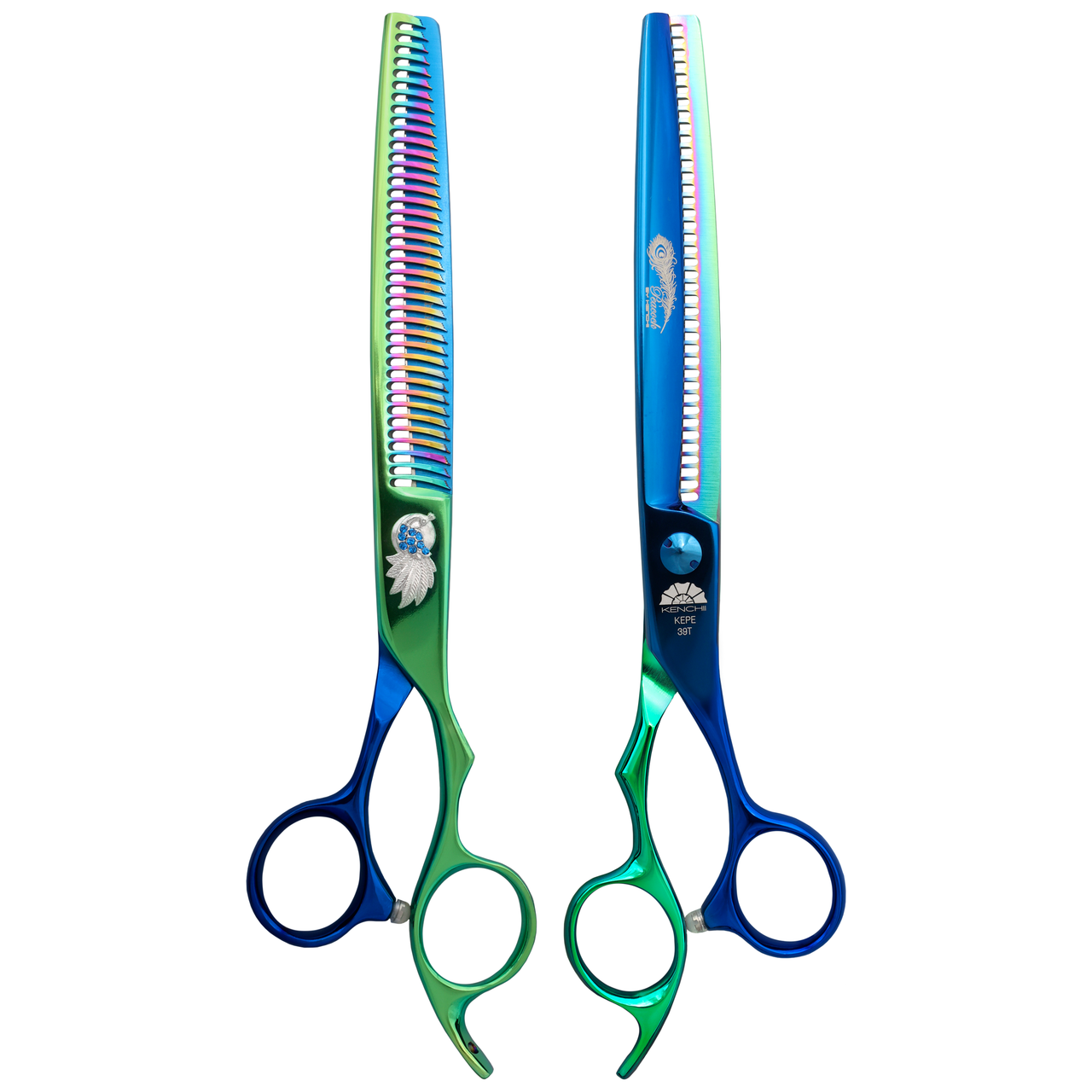 The Kenchii Peacock™ shear effortlessly cuts through even the coarsest of coats. The semi-convex edges are suitable for everyday grooming or finish work and the level 3 alloy ensures a long lasting sharp edge. The Peacock™ has a duotone blue and blue-green titanium finish and custom peacock assembly cap and blade markings.