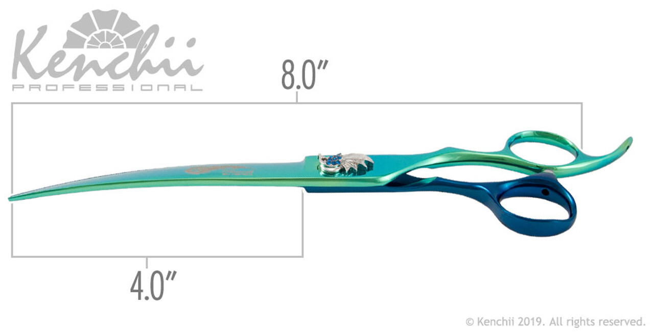 The Kenchii Peacock™ shear effortlessly cuts through even the coarsest of coats. The semi-convex edges are suitable for everyday grooming or finish work and the level 3 alloy ensures a long lasting sharp edge. The Peacock™ has a duotone blue and blue-green titanium finish and custom peacock assembly cap and blade markings.