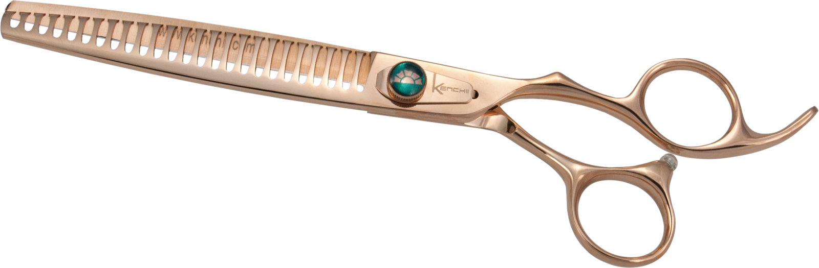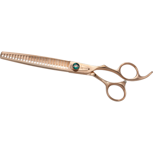 Kenchii Rosé™ scissors and thinners are made from our proprietary level 2 Japanese molybdenum materials enrobed with rose gold titanium. Semi-convex, microserrated edge is designed to reduce slippage and enhance cutting performance. Great for everyday grooming. Comes with oiler and ring insert.