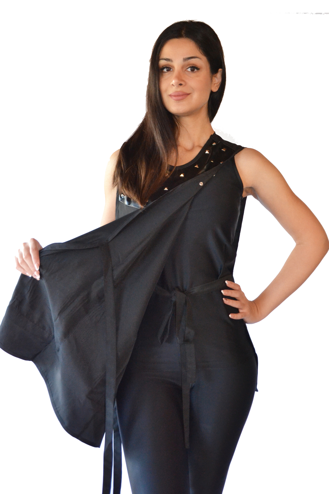 * Featured two front zipper pockets, faux leather trim, square metal studs, covers front, and back, Side tie belts.