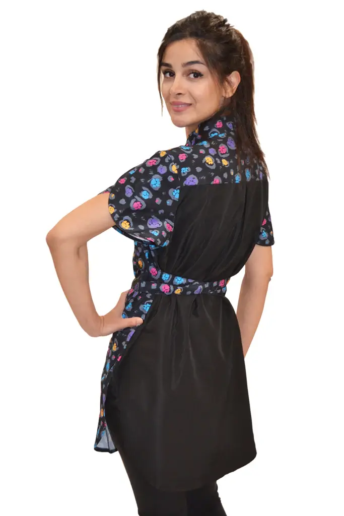 Yes, it’s water, hair and bleach resistant, lightweight and breathable, but we have added a half zip rainbow front zipper that looks great and offers an easy on and off styling. The mini paw print design ensures you make a statement about the type of skilled professional that you are. The tie belt is designed long enough to cross in the back and then tie in the front so a very tailored fit. Sizes XS-6XL.