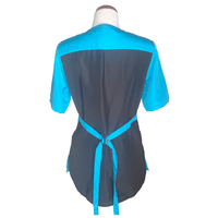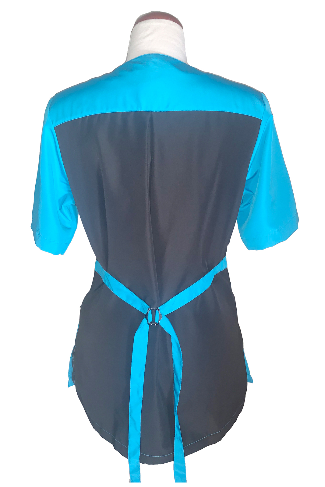 Short sleeve, round neck, A-line at the hip, 2 side pockets, 2-inch side slits, front black color block panel, and black back and shoulder panels, adjustable belt, Sizes XS-4XL. Featuring a Rhinestone Zipper to add a little additional bling to your new favorite smock. 100% treated Polyester.