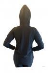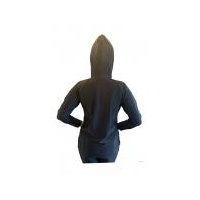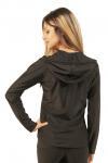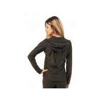 Long sleeve hooded 4 way stretch spandex material hoodie. Where function and fashion meet, with its hair repellent functionality and flattering design. Front zipper, drawstring hood. Makes the perfect match to our figure flattering legging, creating an outfit for work or on the go.