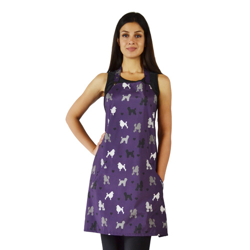 Waterproof with inside mesh lining, Purple Poodle Print design styling. Bleach resistant, Hair repellent, Adjustable neck band, 2 Front Pockets, Tie belt. One size fit most.