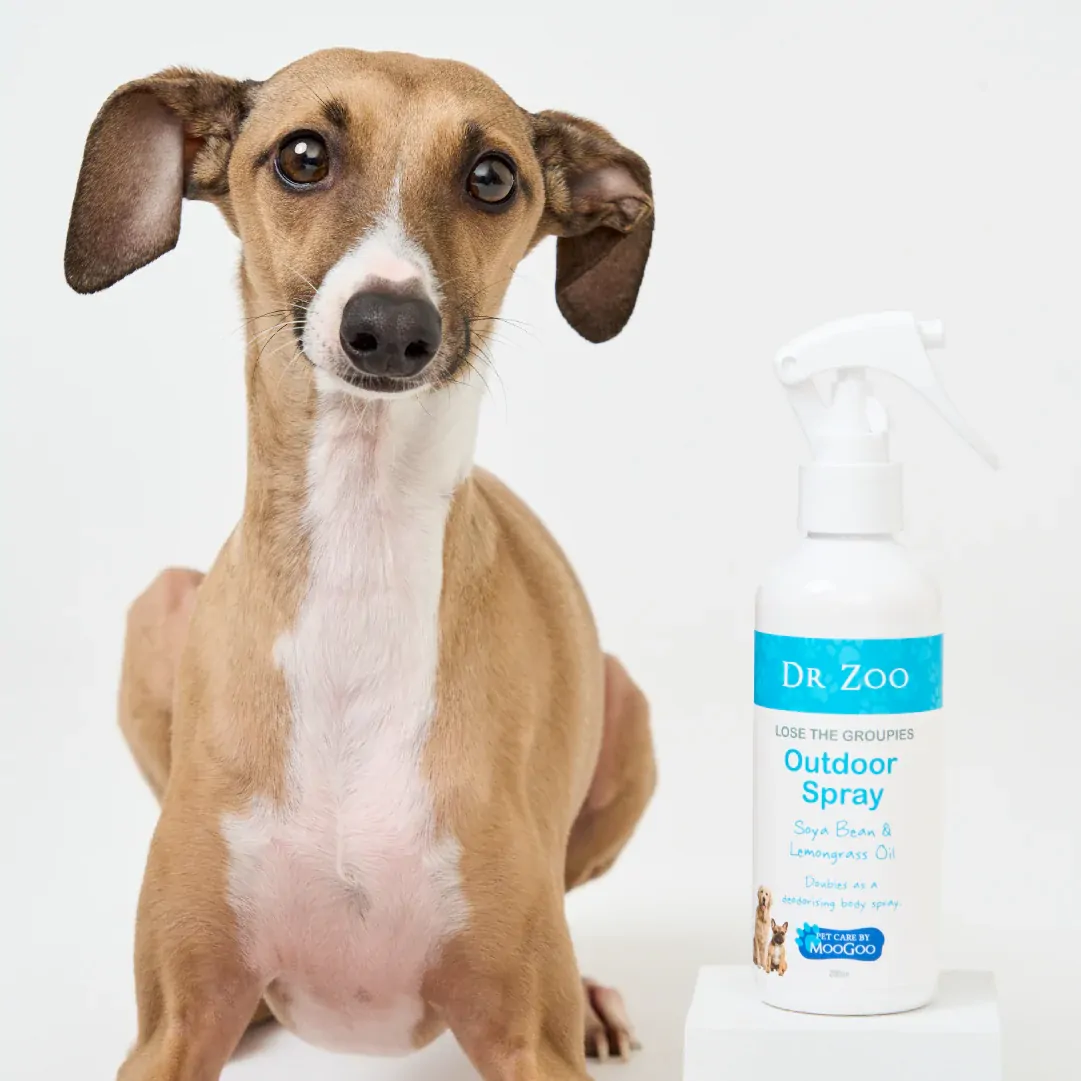 Dr Zoo Lose the Groupies Outdoor Spray is a refreshing, chemical-free outdoor protection designed to help keep your pet free from pesky annoyances. Made with a natural blend of ingredients like Lemongrass and Soya Bean Oil, this spray offers a pleasant, subtle fragrance that both pets and humans will love. It’s safe to use around your pet’s face, so you can spray it without worry, keeping them happy and comfortable while they explore the great outdoors. Key Features: Chemical-Free: Safe for pets and the environment Natural Fragrance: A blend of Lemongrass and Soya Bean Oil Lickable Ingredients: Can be sprayed around the face without concern Dual-Purpose: Also acts as a deodorizing body spray for freshening up your pet’s coat