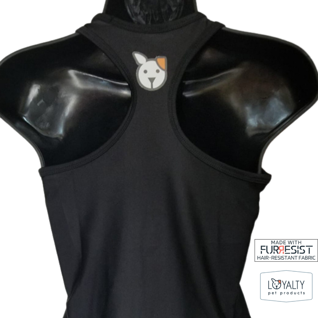 Black Hair / Fur Resistant, Tank Top. Loyalty razor back tank tops are perfect for pet grooming, dog walking, working out or pet bathing. They fit perfectly with the Loyalty Sports Bras !