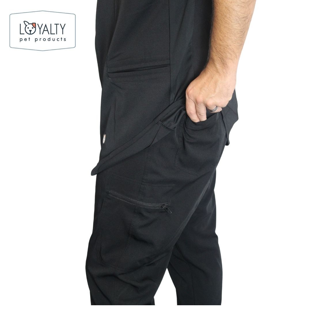 One of our newest additions to our grooming apparel line is one of our most exciting. Our unisex cargo pants allow multiple deep pockets (FOUR, front two have a zipper) , durable fabric that is water-resistant and has an elastic waistband to allow for all sexes to enjoy!