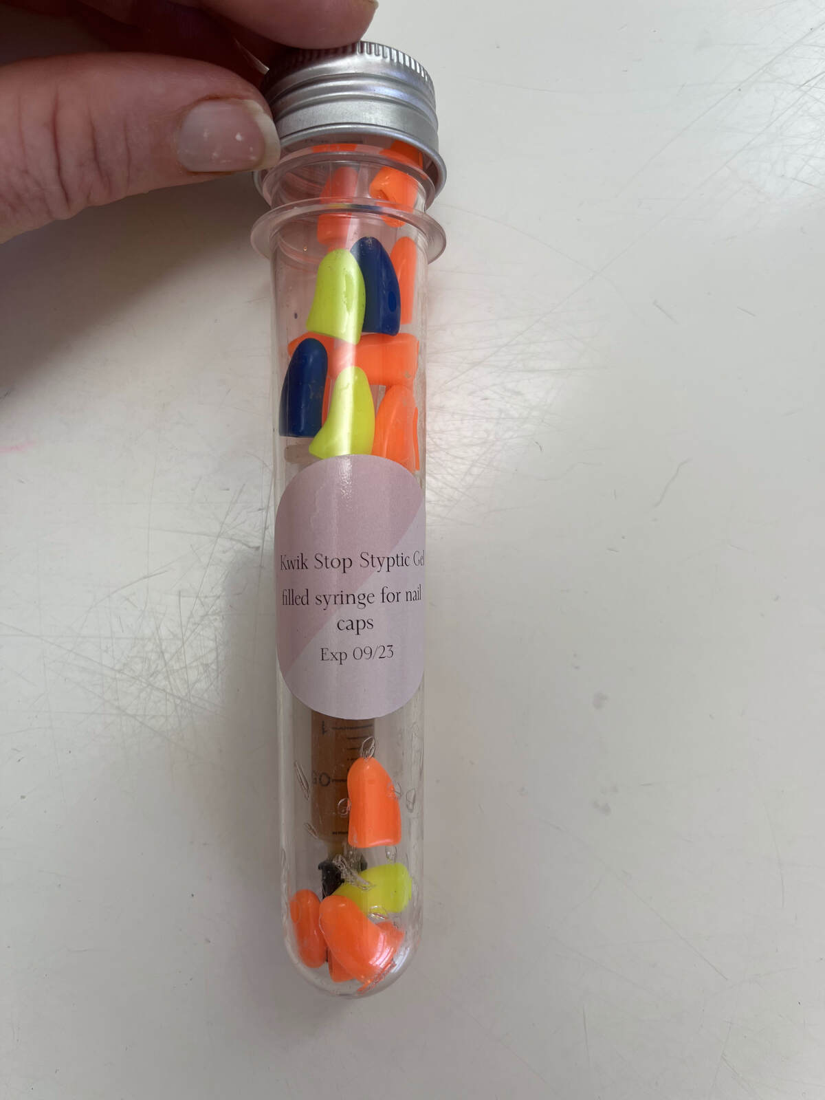 Unique to Medicpet our nail cap system is a quick and easy way to apply first aid to bleeding nails. Comes with assorted sized nail caps (reusable) and coagulant gel with pain relief