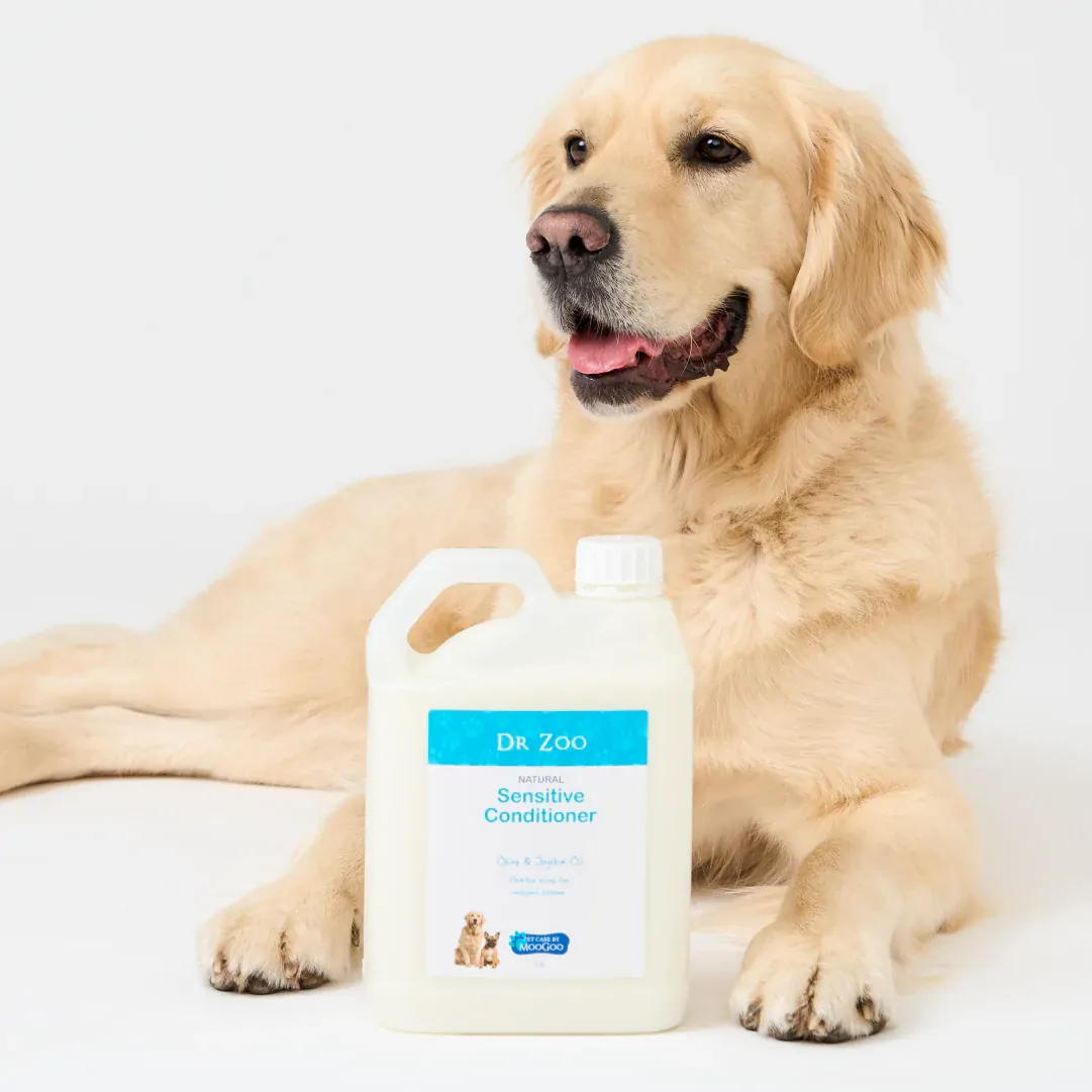 Moisturise, condition, and nourish using natural oils with Dr Zoo Natural Sensitive Conditioner. This products is carefully formulated to nourish both the skin and coat using natural, edible oils that moisturise and protect. Unlike traditional conditioners that rely on silicone, our formula contains Jojoba Oilan excellent natural moisturiser that hydrates the fur without weighing it down. This lightweight conditioner helps maintain a shiny, healthy coat while soothing sensitive skin, making it the perfect addition to any grooming routine. Suitable for: Dogs, puppies, and most pets with sensitive skin Free from: Silicone, parabens, and harsh chemicals Safe if ingestedcrafted with pet-friendly, edible ingredients Dr Zoo's conditioner is ideal for regular grooming, leaving coats soft, smooth, and shiny. With nourishing ingredients like Jojoba Oil and Olive Oil, this conditioner is perfect for pets with dry, dull, or irritated skin.