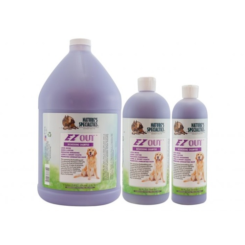 EZ OUT Shampoo is a unique non-irritating, non-drying formulation ideal to help remove undercoat with less mess and less stress making it a WIN for both the pet and the groomer. Working out the undercoat with the shampoo makes it easy to remove unwanted hair without the mess.