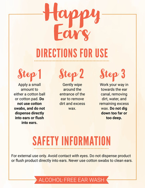 DIRECTIONS FOR USE: Step 1: apply a small amount to either a cotton ball or cotton pad. Do not use cotton swabs, and do not dispense directly into ears or flush into ears. Step 2: Gently wipe around the entrance of the ear to remove dirt and excess wax. Step 3: Work you way in towards the ear canal, removing dirt, water and remaining excess wax. Do not dig down too far or too deep. For external use only. Avoid contact with eyes. Do not dispense product or flush product directly into ears. Never use cotton swabs to clean ears.