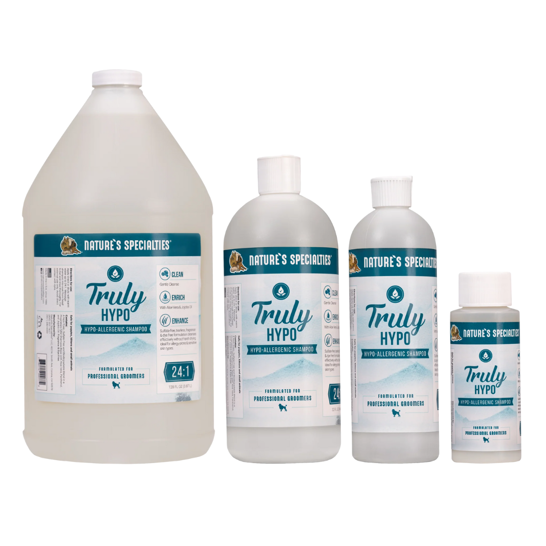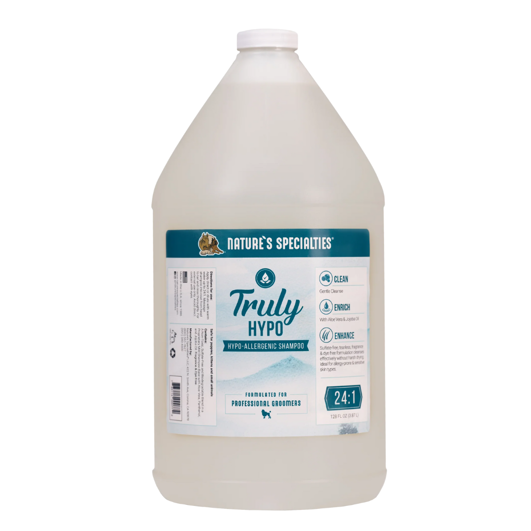 Nature's Specialties Truly Hypo Shampoo is made with a mild, bio-degradable surfactant blend that will provide a deep clean while being gentle enough to prevent irritation on pets with sensitive skin. This tearless, Sulfate-Free, Paraben-Free, Fragrance and Dye-Free formulation gently removes dirt, excess oil, and product build up to leave coats soft and clean, without any harsh drying. Added Jojoba Oil will moisturize the skin to prevent dander and help diminish dullness in the coat. The ideal solution for allergy-prone and sensitive skin types.