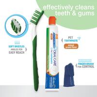 Dog Dental Natural Kit features an angled toothbrush that gently massages your dog's teeth and helps prevent plaque and tartar through mechanical action. The pet toothpaste features Denta-C, which is scientifically proven to reduce plaque that harbors bacteria. Plus, your dog will love its natural peanut flavor. Slip on the finger brush to easily remove excess plaque and food debris. Together, these dental tools promote preventative care, helping to lower the risk of periodontal disease.