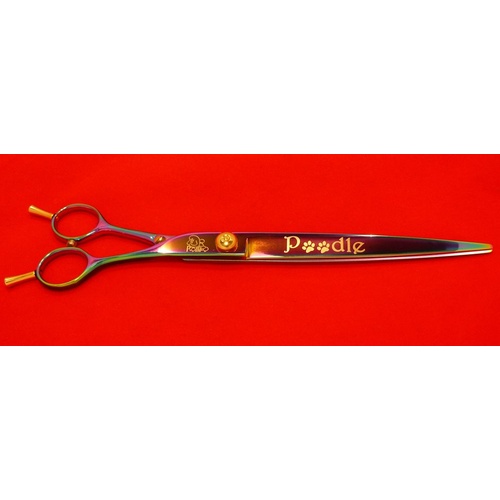 The Poodle Rainbow is a very strong scissor, good for hard and soft coats, good for starting & finishing. The P&W Poodle has a beveled edge wiyh symmetric long handles (suits long fingers well)