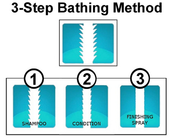 Therefore the secret behind adhering to our 3-Step approach rests in how it mindfully and efficiently conditions the coat repeatedly; once each phase (1 - shampoo, 2 - condition, and 3 - finishing spray). This ensures that the majority of the coat’s hair strands are hydrated, bolstered in strength, and smoothed over: thus sealed before drying. Think of this "progressive grooming logic" as a Close, Further Close, Totally Close method.