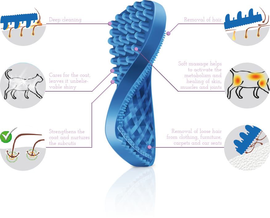 By applying gentle pressure the loosened sebum will cling to the silicone brush. Your four legged friend will love the extra attention given with this massage. It relaxes tensions. The metabolism gets stimulated and this creates a comforting feeling in your dog.