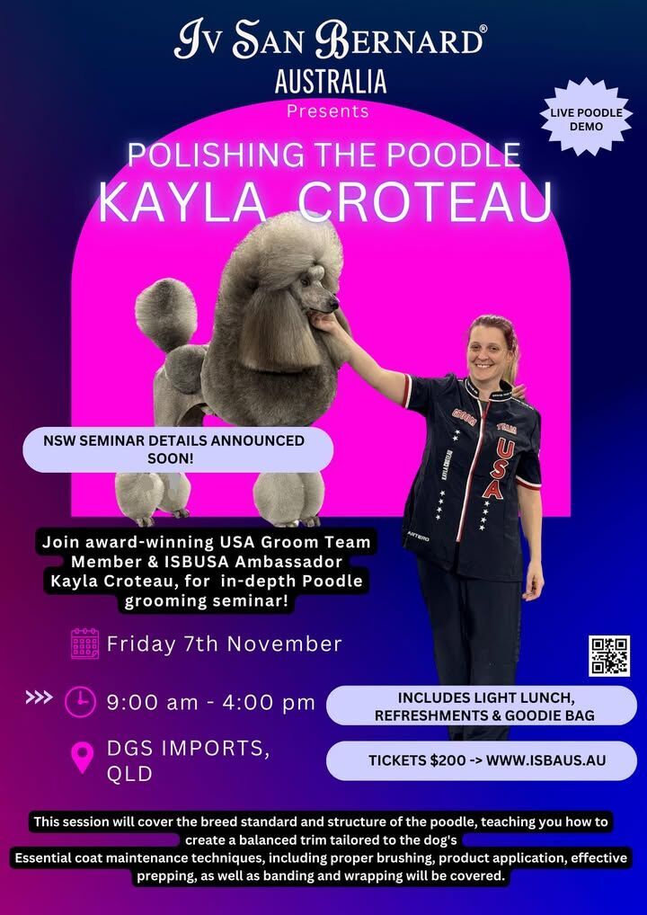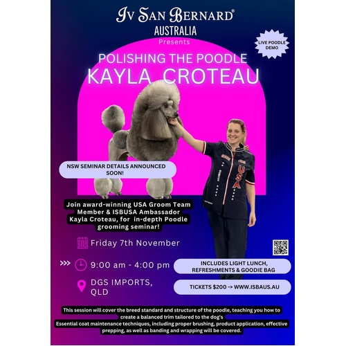 Join award-winning USA Groom Team Member & ISBUSA Ambassador Kayla Croteau, for in-depth Poodle grooming seminar! This session will cover the breed standard and structure of the poodle, teaching you how to create a balanced trim tailored to the dog's Essential coat maintenance techniques, including proper brushing, product application, effective prepping, as well as banding and wrapping will be covered. DISCOUNTED EARLY BIRD TICKETS AVAIL UNTIL AUGUST 2025