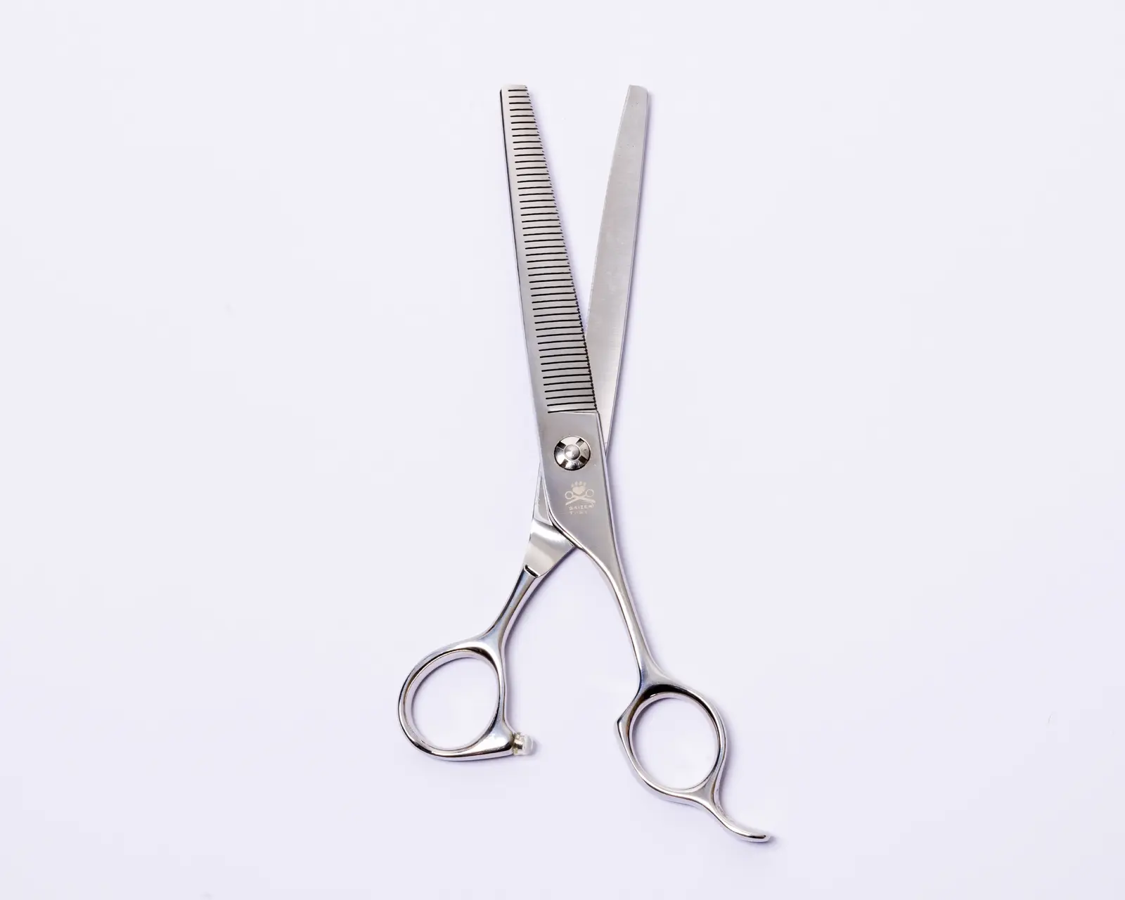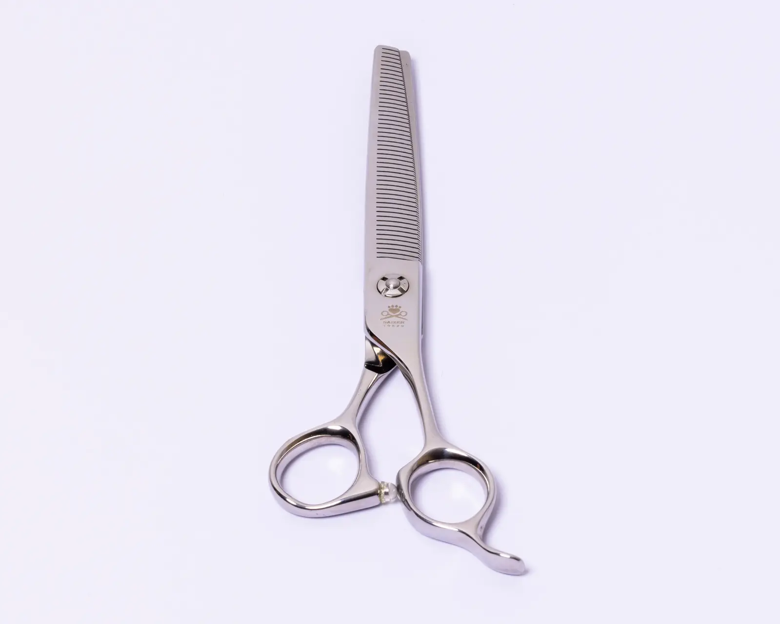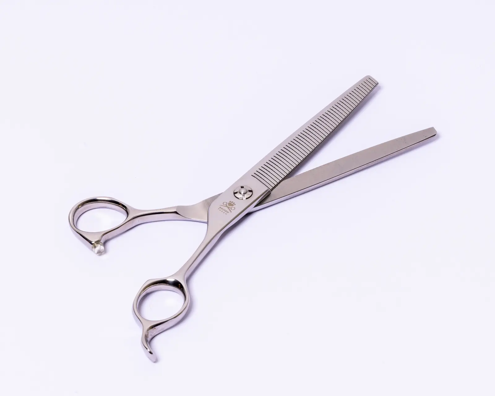 Introducing the newly designed Saizen Tokyo Professional Pet Scissors. This amazing straight, offset handle, 7.0 inch, 50 teeth, Blender/Thinner has a 50-60% skip rate. Therefore, these scissers are easy to use with a soft finish that can be used to blend fur.