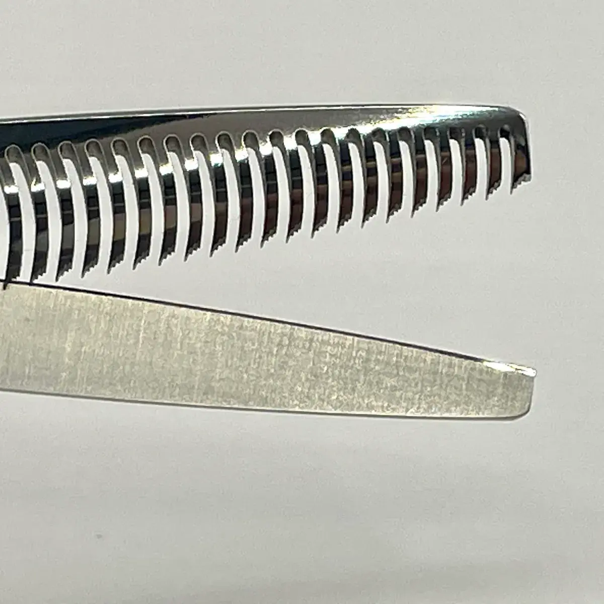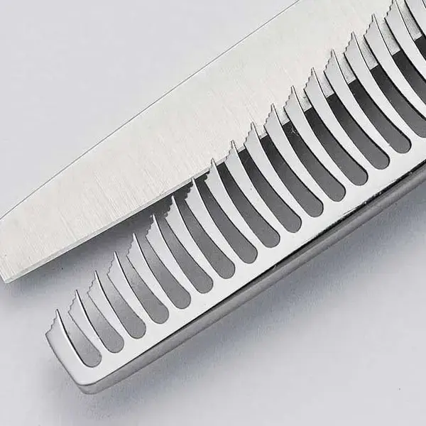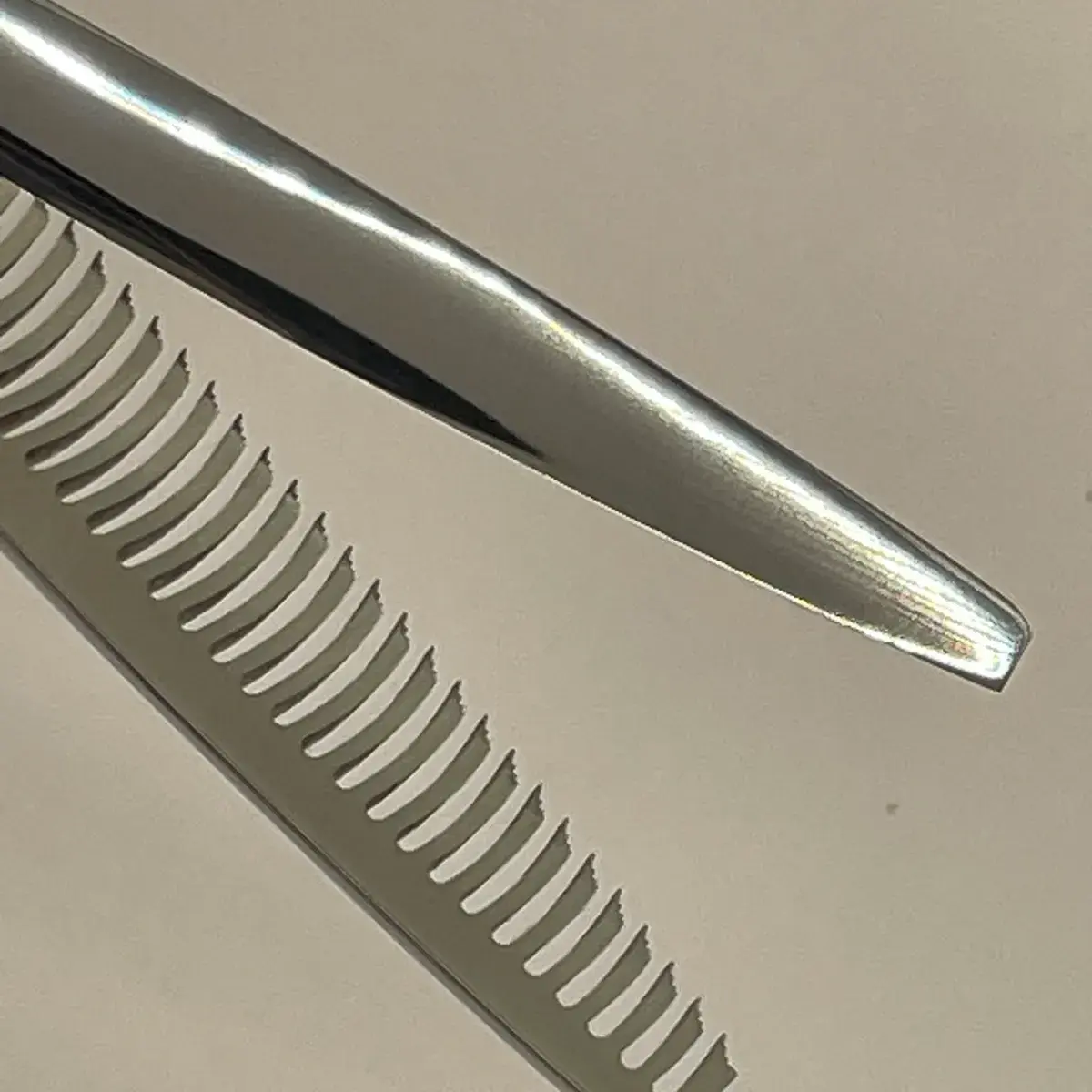 Their micro serrated edge is more like a multi-purpose cutting edge because it provides many value added benefits. These thinning shears have a stepped blade shape with a comb blade that makes the cut line less noticeable. Additionally, the most well known benefit of a serrated edge, is that it does not allow the hairs to slip or skip from its tiny micro teeth. This allows for precision cutting as each hair that comes under the serration is cut immediately on the spot.