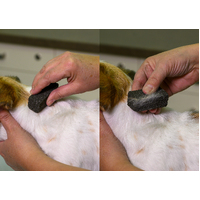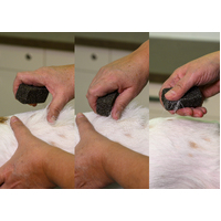 Take the stone in your dominant hand and with the thumb of your other hand, hold the skin tightly. Then with a gentle movement and without pushing downwards too much, comb in the direction of the coat growth using the stripping stone in order to remove the undercoat. This is a first way of hand stripping with a stone.