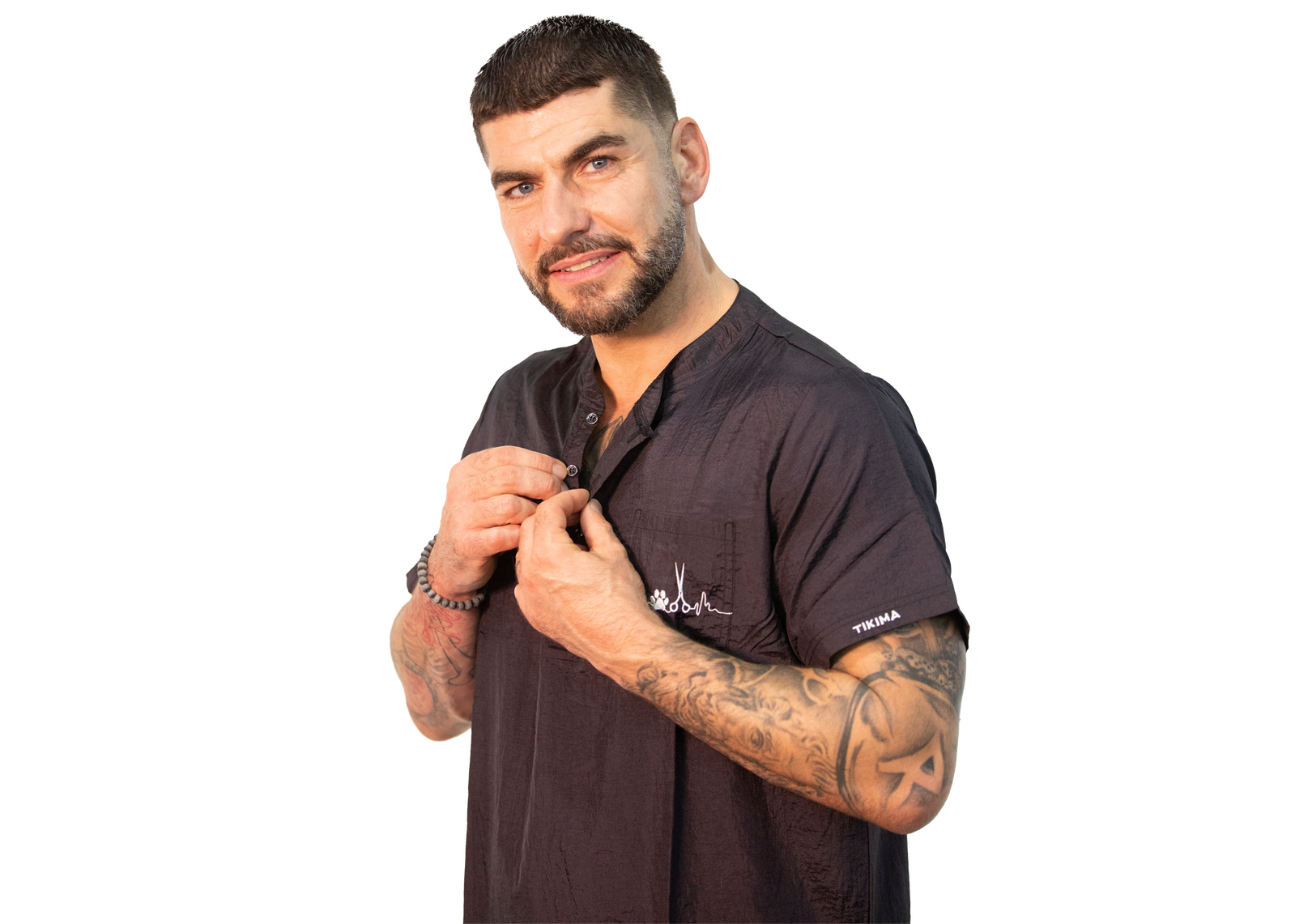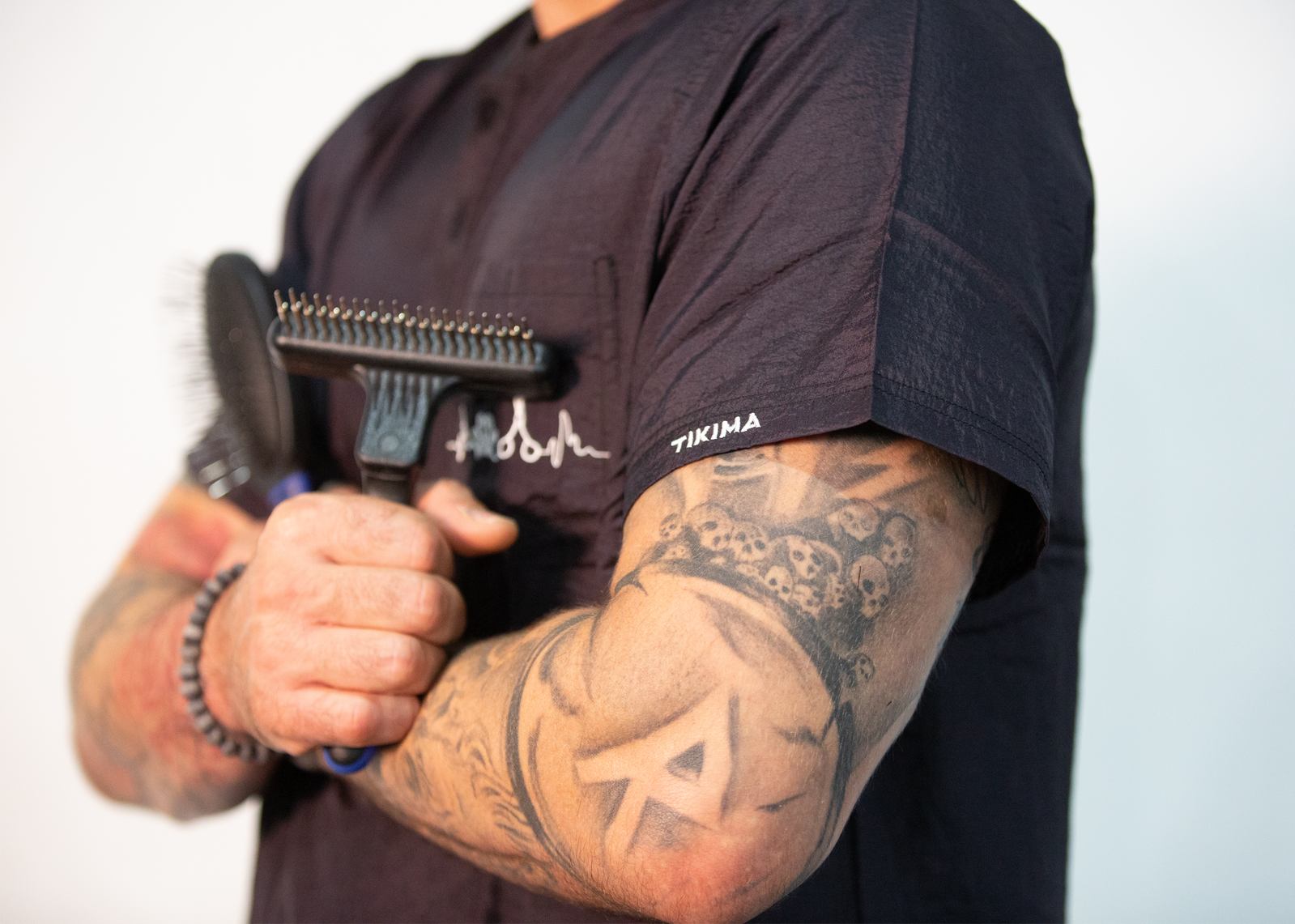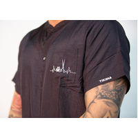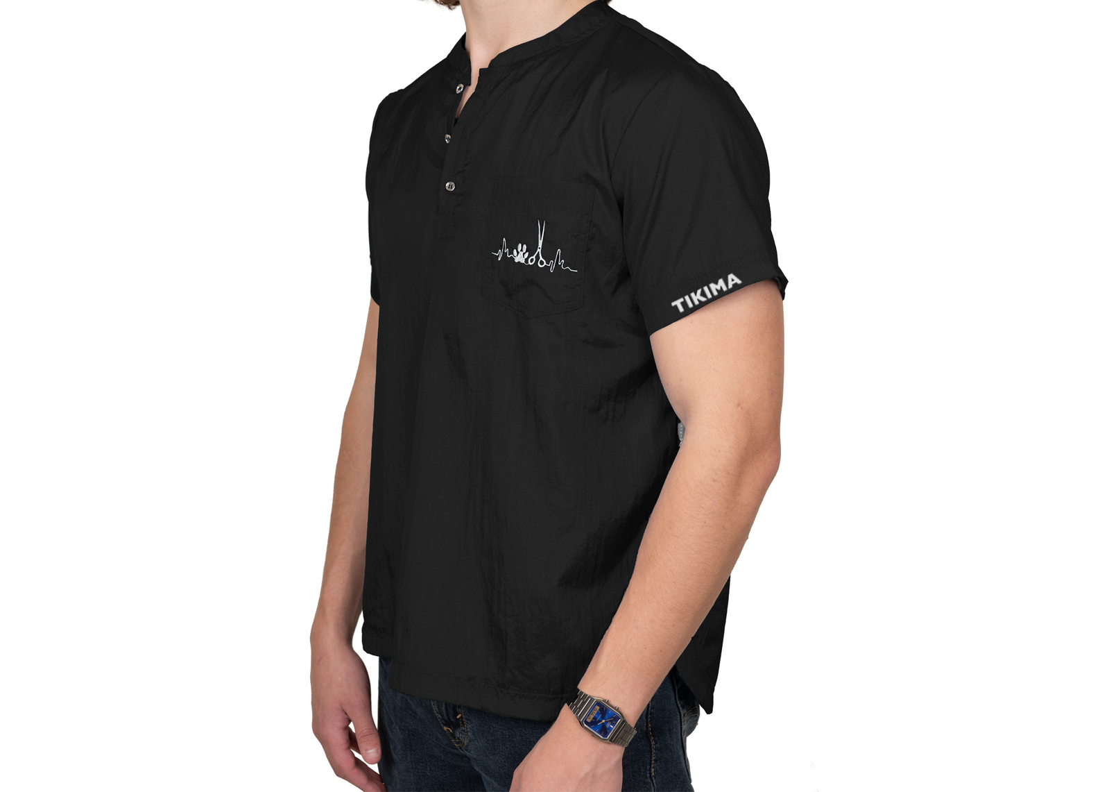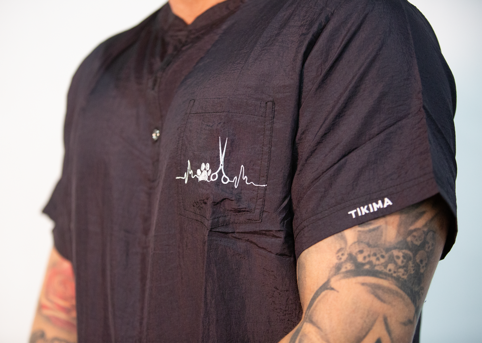 In addition, the Tikima Figari shirt is made with hair-proof material, ensuring that hair will not stick to it during grooming sessions. Featuring a short sleeve design, this shirt is perfect for warmer days. The small embroidered scissors & pawprint on the front and Tikima name on the short sleeve add a touch of personality and showcase your passion for dog grooming.