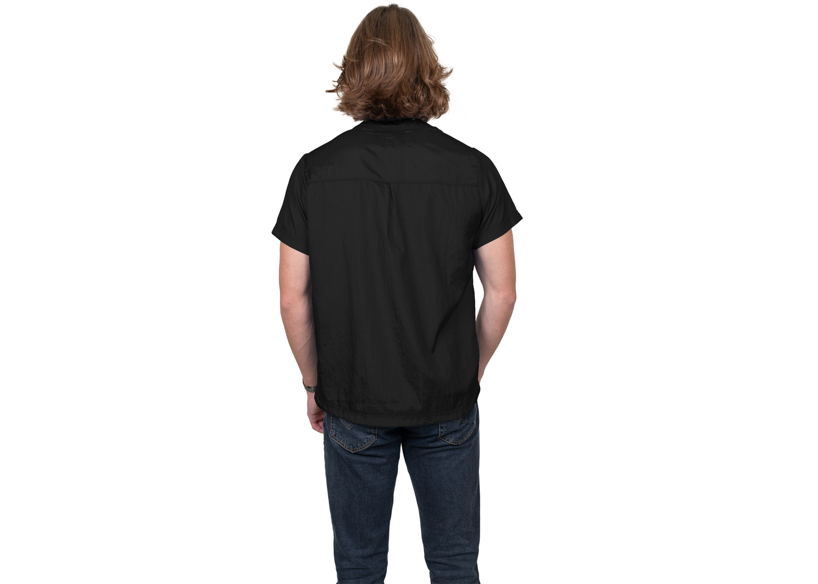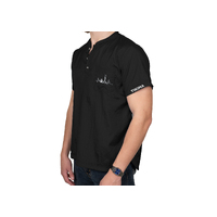 The shirt has a small front pocket and a band collar with three buttons for style and ease of wear. The two short rounded side slots provide comfort and mobility during long grooming sessions or active work. It's a stylish and comfortable shirt for any occasion.