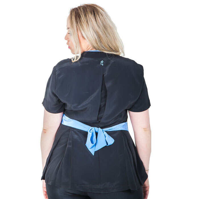 Step into your salon with a new sense of confidence wearing our attractive Bow Tie Top. Its adaptability lets you synch in the waistline to compliment your individual figure; whilst the mandarin neckline, printed yoke and contrasting piping allows you to look both professional and elegant.